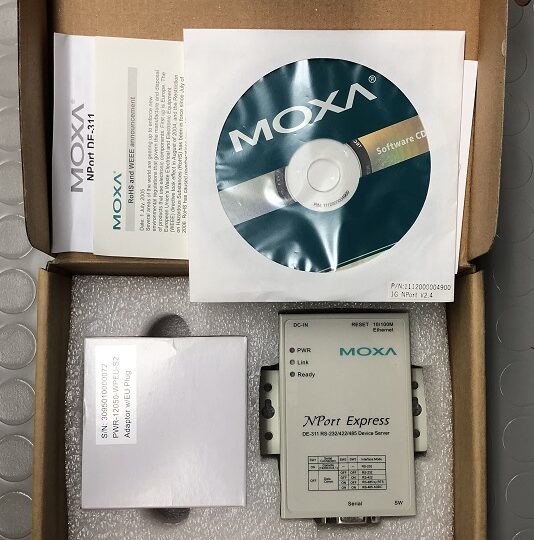 Dispositivo di controllo porta seriale RS232-422-485 su TCP/IP. Confezione con alimentatore e software su CD.