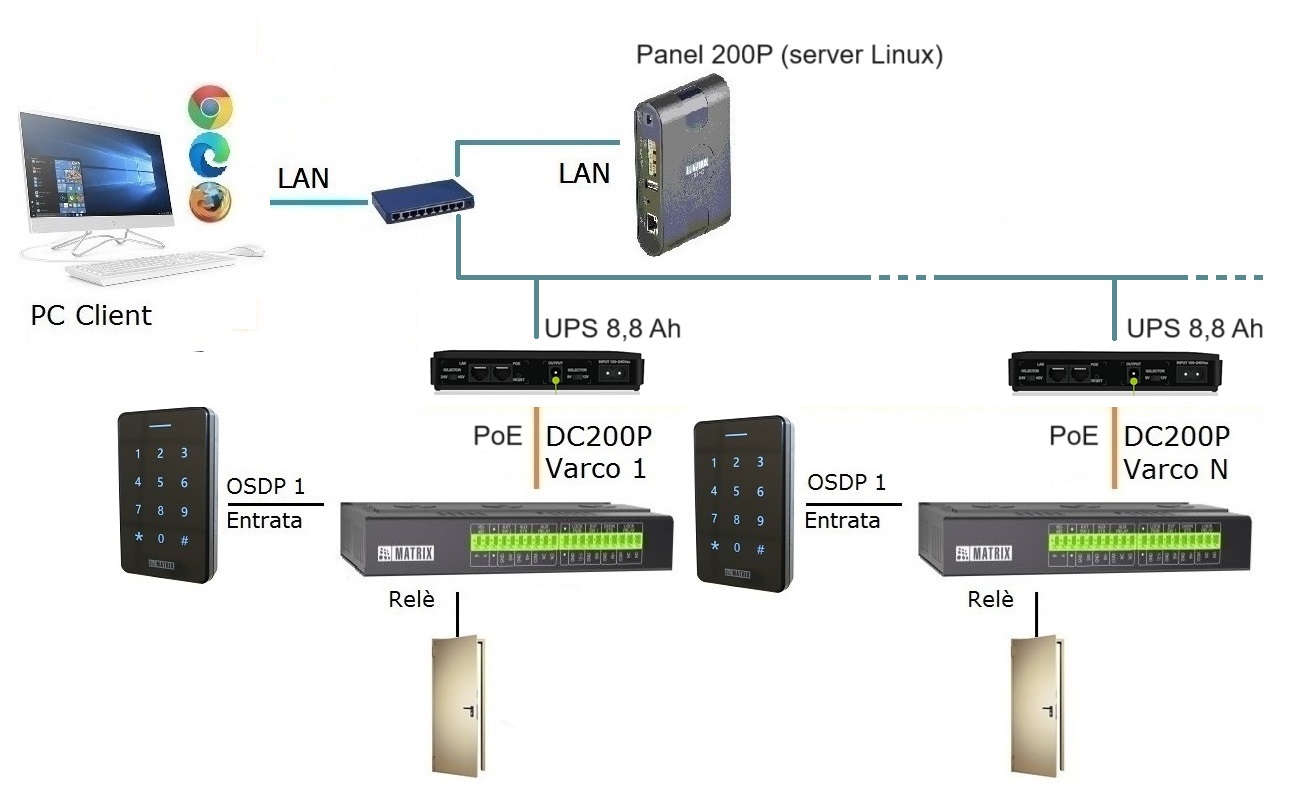 L’architettura di sistema permette di collegare fino a 255 DC200P ad un server PANEL LITE, così da eseguire la configurazione e la programmazione dell’impianto via PC Client attraverso il browser. Sono disponibili API per le integrazioni in sistemi di terze parti.